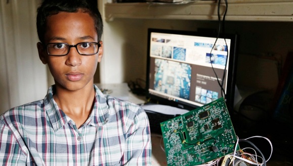 在得州麦阿瑟中学內唸9年级的穆罕默德,本周一戴著眼镜、穿著美国太空总署的T恤,锁上手扣被警员押走,只是为了那个被误以为是炸弹的时钟。警方把他带到一个羈留中心,替他打指模及拍摄嫌犯照片。事件迅速传开,他被锁上手扣的照片在网上疯传,引起各方爭议,许多人批评校方和警方处理不当。