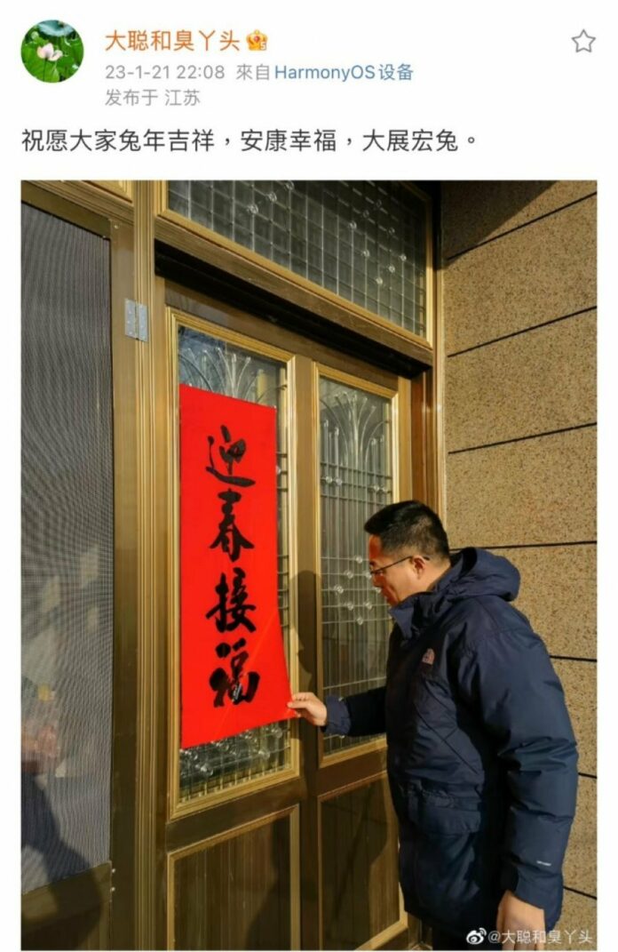 香港《星岛日报》报导,照片中的赵立坚身穿一件蓝色大衣,在门口贴上“迎春接福”的挥春。网民关注到贴文发布于江苏,因赵立坚是河北人,猜测可能是陪汤天如回娘家。