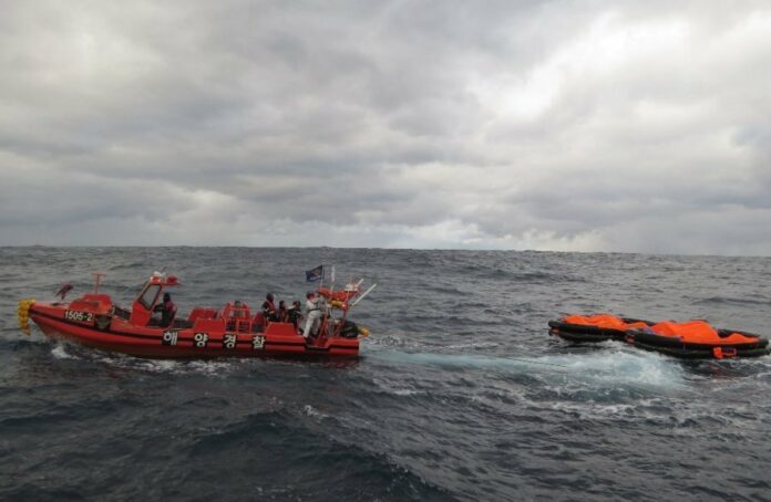 济州海警厅正在事故地,与日本海上保安厅联动搜救船员。经确认,22名船员中有12人被济州海警和其他船只救起,但仅有一人存在意识。