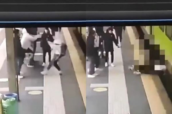 影片中,只见穿着白色连帽上衣的少年(15岁)坐在月台的候车处等待火车进站,接着有两名黑衣少年接近,双方发生争执,此时,后方跑来一名穿着白色外套的少年,二话不说伸手就推,导致连帽上衣少年摔下月台,当时正好有一列行驶中的火车经过,少年以头下脚上的姿势摔进火车与月台间的缝隙,吓得动手的少年和其他民众赶紧上前救人。