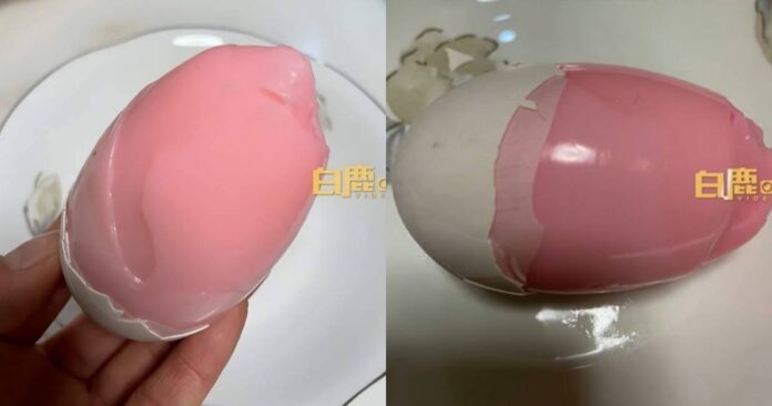 中国江苏徐州一名女子近日在路边买鹅蛋,煮完后蛋清却是粉色的,让她当场傻眼,不敢贸贸然吃下肚。