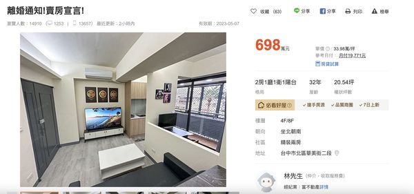 在网路售屋平台有一间「离婚宣言」物件求售,短短刊登5天就吸引近2万人朝圣,文案内容以第一人称视角撰写但都与物件息息相关,包含「当初追老娘的时候怎么说的?你只给我这间20坪的房子」、「管理费才800块你也舍不得帮我缴!」、「你不在我没有温暖了,这间房随便租个18000~20000万元都很好租!」、「老娘不演了摊牌了,今天就讲清楚,这间房银行估价随便都超过8成。」等等。