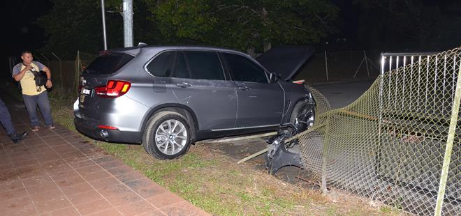 是宗车祸于今天凌晨约12时发生在南兰律警局前方交通灯处,豪华休旅车司机是名50余岁的拿督,他当时驾车欲返回丽华宝岛的住家。