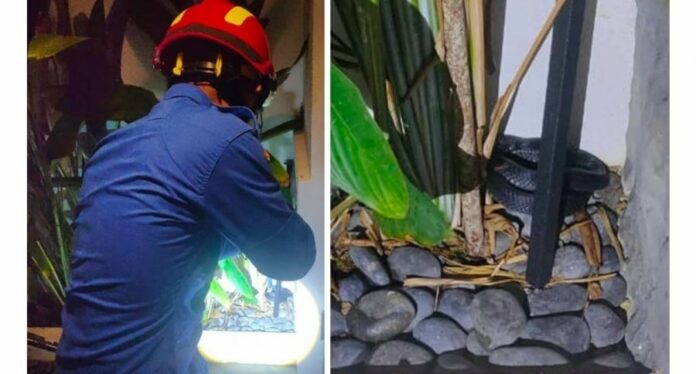 大马民防部队人员当场使用专用设备,随即成功捕获黑色眼镜蛇。
