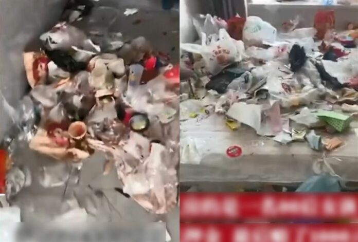 影片显示,屋内被宝特瓶、外卖、食品包装等垃圾铺满地板,看不到可以走的路,连床都全是垃圾,看不出有睡觉位置。
