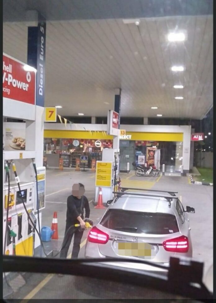 (新山24日讯) 一名驾驶新加坡注册马赛地轿车的男子偷添RON95津贴汽油,遭同油站添油的民众拍下照片上载至社交媒体,网民讥讽车主买得起昂贵豪华轿车,却没有钱添贵油。