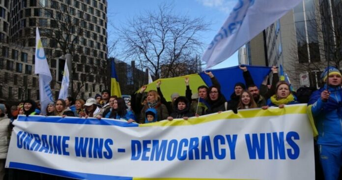 (布鲁塞尔26日讯)细粒冰雹混著雨滴落在布鲁塞尔市中心街头,约5000名各色人种、男女老少顶著风雨呼喊“乌克兰万岁”、“停止战争”、“恐怖分子普京”,在俄乌战争满周年的第一个周末提醒世人持续支持乌克兰。