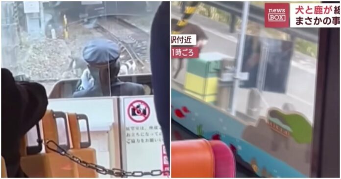 中央社引述日本朝日电视台2月23日报导,这列受阻电车在静冈县热海市的JR伊东线伊豆多贺站附近临时停车,司机透过广播表示“在恢复行驶前请大家稍待片刻”,原因是电车前方的轨道区,可以看到有几只狗跟一头拥有雄伟鹿角的公鹿。