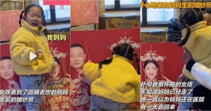 令人鼻酸的画面!中国安徽省有一名妇女,去年12月因肺癌不幸离世,但女儿到现在还不知道妈妈已经走了,一直以为妈妈还在住院。最近办完妻子后事的丈夫,在整理房间时,翻出了昔日与妻子拍的幸福结婚照,没想到3岁女儿一看到妈妈的照片,开心地大喊“我妈妈”,并冲上前去亲吻照片里的妈妈,整个过程都被影片记录下来,曝光后让众多网友看了心头一揪,忍不住红了眼眶。