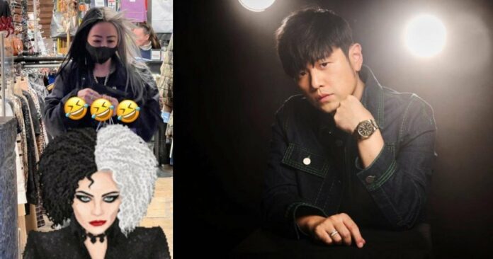 周杰伦在限时动态上晒出自家发型师的照片,并表示“我发型师这idea不知该说什么”,只见发型师中分的长发,一边是黑发色,另一边则是白发色,让周杰伦联想到了“迪士尼史上最邪恶的女人库伊拉”。