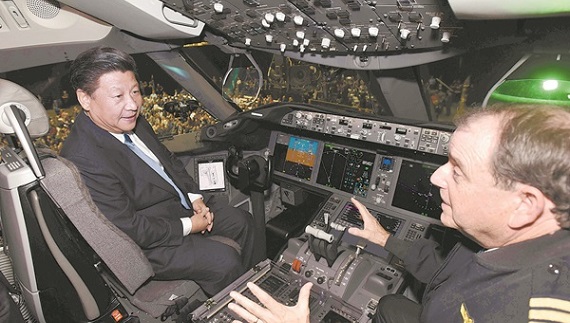 习近平抵达波音製造厂时,该公司总裁康纳率企业负责人和员工代表热情迎接,並向习近平介绍公司情况,又陪同参观。走进高大宽敞的组装车间,习近平不时驻足观看,並询问航空节能减排措施,瞭解未来飞机设计理念。