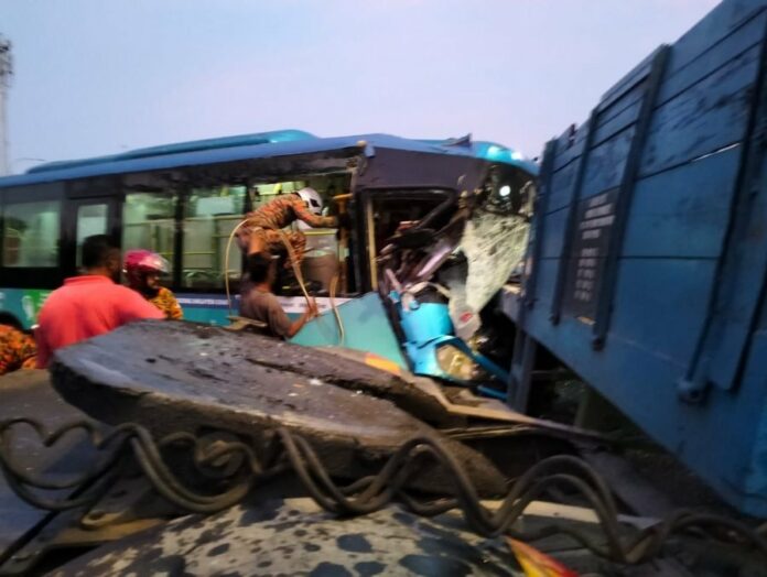(怡保22日讯)一辆公共巴士与一辆拖格罗里今天上午在接近昆仑浪山附近的江沙路段发生碰撞,公共巴士车头严重损坏,巴士司机因此被夹伤,已被消拯员救出,送院治疗。