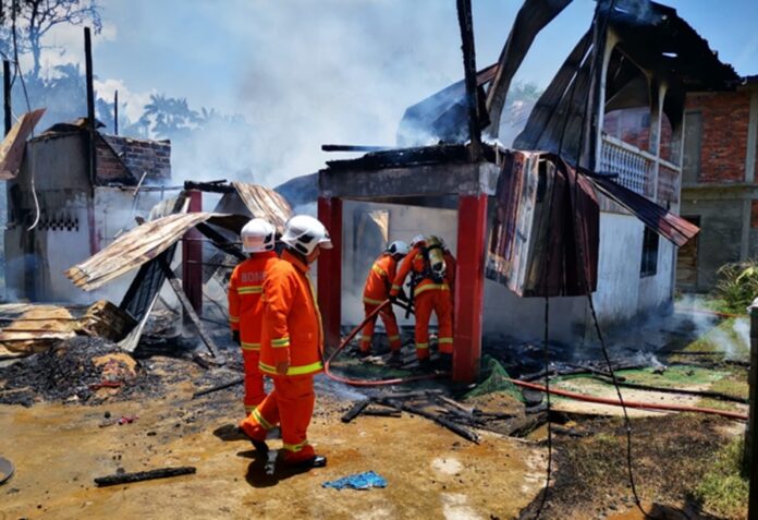 亚庇23日讯|京那律甘榜沙卜今午1间房子遭遇大火,1名消拯员救火时不慎触电灼伤。