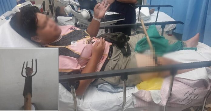 (民都鲁24日讯)20岁女子被友人误当成蛇,竟使用鱼叉插入她的大腿,导致腿部受伤入院,医务人员随后也求助民都鲁消防与拯救局,设法取下鱼叉。