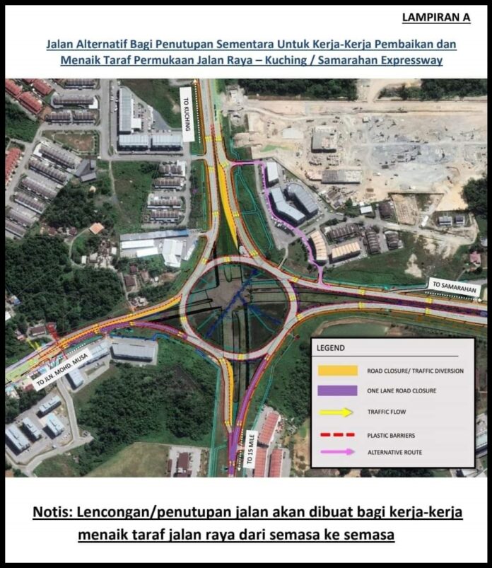 公共工程局发文告指出,受工程影响的道路是古晋到三马拉汉、三马拉汉到15哩、15哩到三马拉汉、三马拉汉到莫哈末慕沙路;和莫哈末慕沙路到三马拉汉。