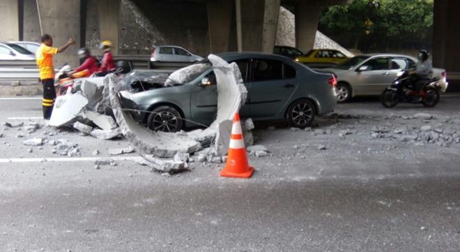 (沙登28日讯)拖格罗里司机载送石灰管途中,水泥管不慎碰撞到高架天桥而碎裂並掉下大道,殃及后方的五辆轿车,所幸无人伤亡。