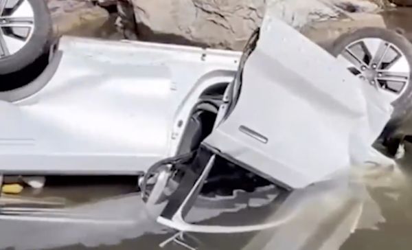 透过现场救援人员拍摄的影片可以发现,这辆挂有河南车牌的白色电动车呈180度翻转摔落在河床上,车顶已淹没在水中,车体严重损坏。救援队成员表示,当地村民带着他们穿过小路才到达事故地点,「摔落的车辆残骸距崖上的山路约100公尺左右,得有20层楼高。」
