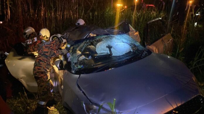 (美里11日讯)汶莱轿车司机载着未婚妻及2名男乘客,绕转交通岛时突然失控撞入草丛,这起意外不幸酿成1死1伤。