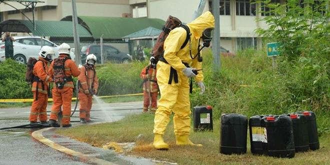 (诗华快讯/亚庇)一辆三吨羅里遇車禍導致所運載的硝酸(nitric acid)傾瀉溢出路面,消防局如臨大敵出動了危害物質隊伍到場,並且架起了屏障防止閒人趨近,暫時沒有造成傷亡。