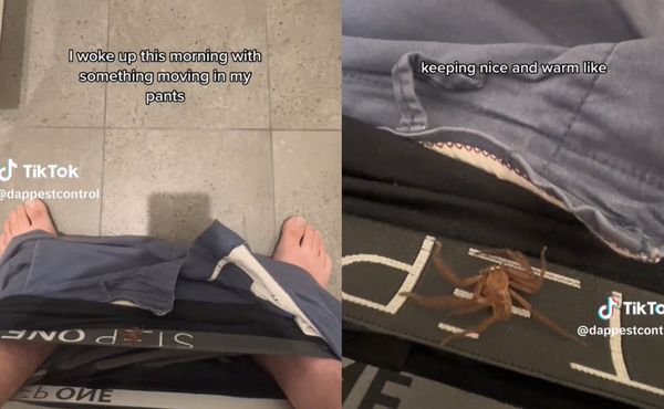 男网友dappestcontrol近来在TikTok分享一段影片,影片中可看到,男子脱下裤子后,内裤上竟然可以看到一只大蜘蛛,他表示,「早上醒来发现裤子有东西在动,这只蜘蛛靠着我下体睡了一整晚」。
