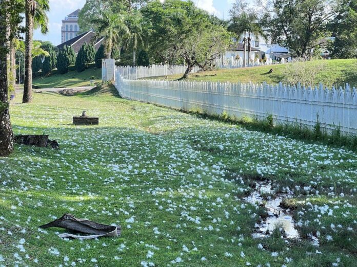 (古晋21日讯) 下雪了,非也~是砂拉越元首官邸範圍內的一棵木棉花盛开,附近地方满满都是棉花一片,吸引不少跑步民众停下来拍照留念。