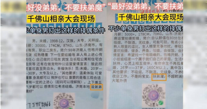 陆媒《齐鲁晚报》报导指出,第17届千佛山向亲大会于21日展开,虽然当天天气气温较低,但仍有不少人上山寻觅姻缘,有不少单身男子在现场留下了自身讯息以及择偶条件,许多人都要求女方不能有弟弟;也有不少单身女子的条件上强调自己「不是扶弟魔」、「自己弟弟有固定工作」等。