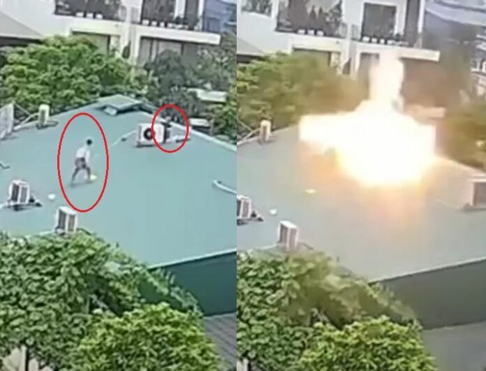 综合越南当地媒体报导,案发现场对街监视摄影机拍下恐怖瞬间,据了解当天是周五(21日),一名工人蹲在屋顶冷气室外机旁修缮,此时另一名工人也走近,就在他来到室外机旁时,突然发生大爆炸。