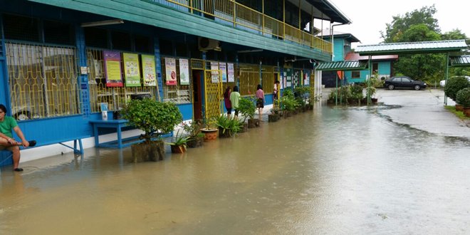 (山打根14日讯)位于山打根拉卜路的14哩民众小学及16哩贡贡小学今早不约而同遭遇闪电水灾,洪水涌入各自校园,导致学生们无法正常上课。