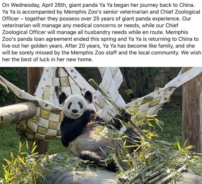 中新社报导,孟菲斯动物园当天在社交媒体发表声明,孟菲斯动物园与中方关于大熊猫租借协议于今年春季到期,所以“丫丫”将返回中国。声明表示,在过去20年的时间里,“丫丫”已经成为“家人”,孟菲斯动物园的工作人员和当地居民会一直想念“丫丫”,并祝福它“在新家过得好”。