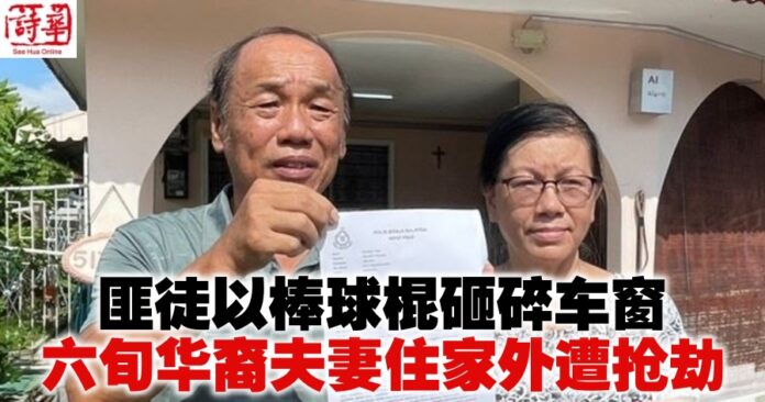 (马六甲1日讯)一对六旬夫妻晚上从市区回家时,在住家前遭2名骑摩哆匪徒盯上,匪徒不但以棒球棍砸碎车窗企图抢走妇女手提袋,更用棍捶打男子的大腿,直到夺走该夫妻的钱财后才肯离去,行径猖狂!