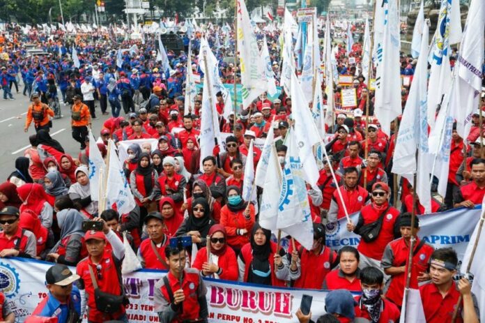(雅加达1日讯)印尼工会团体在五一劳动节之际,于雅加达及泗水等城市发起游行,雅加达多个主要干道上午开始封闭,千名军警在场戒备。主办方称,约5万人参与游行,齐声反对刚通过的“创造就业综合法”,批评此法过于亲商。