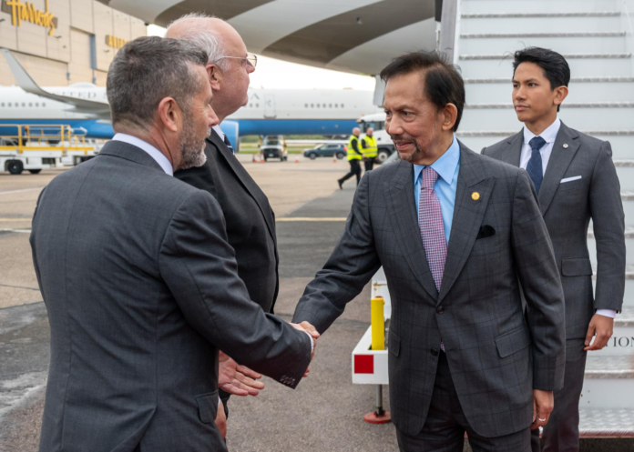 苏丹陛下抵达伦敦斯坦斯特德机场后,英国国王代表格伦·梅斯副统领和外交大臣特别代表迈克尔·约翰·霍洛韦的迎接。