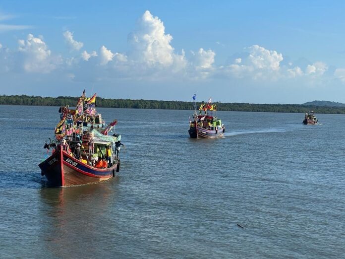 相关的海上巡游活动﹐是在今午2时开始进行。在完成一系列的相关仪式后﹐该载有妈祖娘娘金身的渔船﹐就在其他3艘渔船的“护航”下展开巡游。