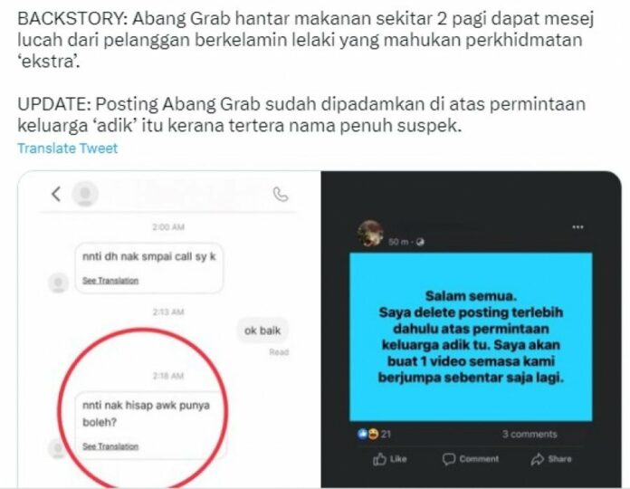 (吉隆坡17日讯)一名女子揭露,一名男性顾客于凌晨透过外卖平台性骚扰送餐员,并提醒民众都要保护好自己!