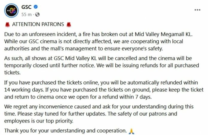 (吉隆坡16日讯)谷中城(Mid Valley)购物广场今早发生祸患,大马电影院GSC稍早在面子书上宣布,电影院将暂时关闭。