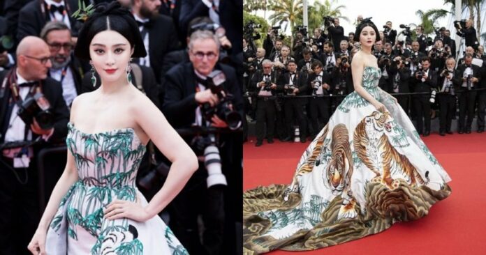 第76届康城影展17日开幕,范冰冰身穿一袭中国风“猛虎下山”图案的礼服,一现身就成为现场镁光灯的焦点,造型师好友也发文称:“这个衣服为你整整存了六年!再次看到还是感动!”