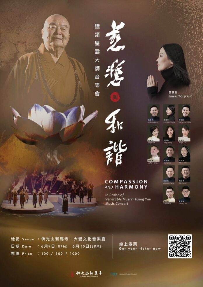 (新山18日讯)佛光山新马寺将于6月9日(周五)及10日(周六),晚上8时,在该寺大觉堂音乐厅隆重举办“慈悲与和谐”赞颂星云大师音乐会,14名创作歌手将以多首星云大师创作曲,以音声缅怀及赞颂一代大师。