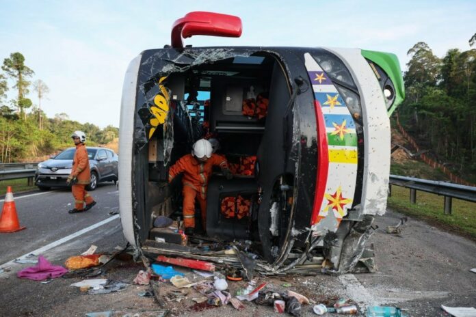 根据登嘉楼消防及救援局表示,他们是于今早5点16分接获投报,并马上赶往案发现场,而这辆巴士是在今早是在靠近武吉勿西(Bukit Besi)路段撞毁。