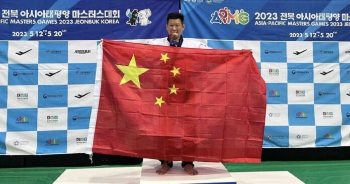 据亚太壮年运动会官网,李东宪14日在跆拳道品势个人组40岁组别中取得铜牌成绩。多家中国媒体报导,李东宪在领奖时,将整齐叠好的五星旗展开举起,并自信地站上颁奖台,前4名选手合照时,他便与并列铜牌、第4名的中国选手一同举著五星旗合照。
