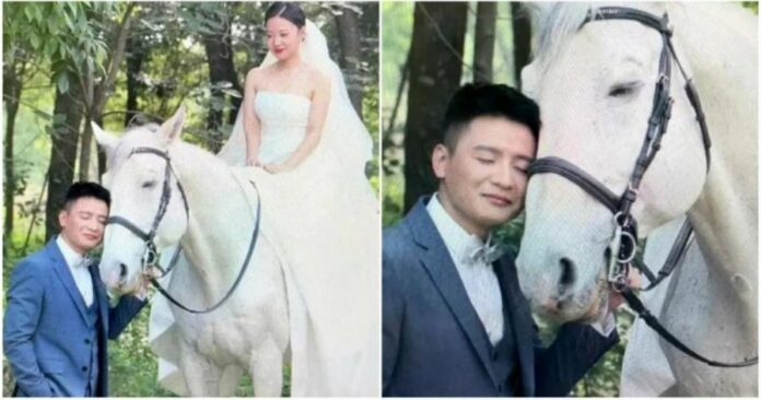 《快科技》报导,27岁山东女子伊米近日在社交平台发布一张自己的婚照,分享在拍摄当日经历了难忘又搞笑的经历,其中有一组照片是这对新人与白马一起入镜的。