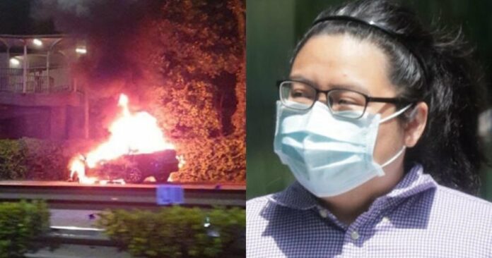 据早前报导,被告的车在撞上围栏后起火,所幸被告立即打开车门逃出。现场10来名好心人使用约20个灭火器,试图帮忙灭火,最终在民防部队抵达后才成功将火扑灭。