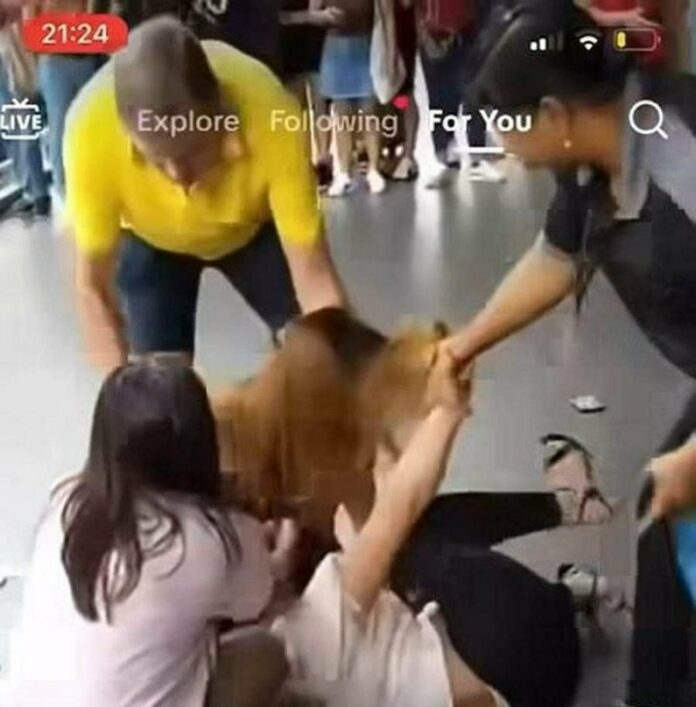 面子书昨午流传一段视频,内容是两名女子在上述地点公然打架。当时,一名女子倒在地上,紧紧抓著另一名女子的头发不放,后者则跨在前者身上,不断挥拳。