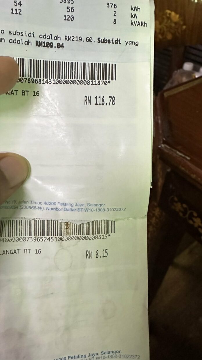 “国能可以再来检查一次吗?我上个月的电费才8令吉15仙,怎么这个月电费就涨至118令吉70仙,这是没有冷气机、电视机及Wi-Fi的甘榜木屋,为何一个月的电费超过110令吉?希望国能可以派工作人员前来检查,谢谢你们!”