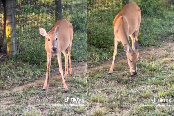 近日网路疯传一段影片,网友「@thebeardedbowman」日前开车行经一处路段时,看见路边有一只小鹿正在吃东西,于是好奇地将车子停下观赏,并用手机录下画面,不过当他把镜头拉近后,才看清小鹿嘴里吃得津津有味的东西,竟然是一条细长的蛇,让他当场吓傻。而小鹿发现有人在看也不在意,仍然继续大口享用着「零食」,仔细看能发现蛇头已经快要被啃断,露出了一些粉色筋肉。